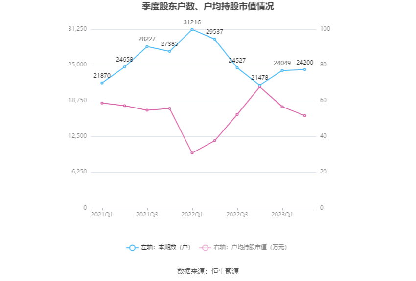 筹码集中度方面,截至2023年二季度末,公司股东总户数为2.42万户,较一季度末增长了151户,增幅0.63%;户均持股市值由一季度末的56.64万元下降至51.66万元,降幅为8.79%。