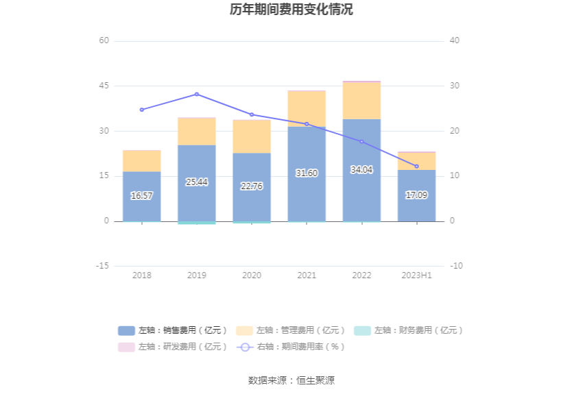 2023年上半年,公司期间费用为23.20亿元,较上年同期减少1.38亿元;期间费用率为12.21%,较上年同期下降3.82个百分点。其中,销售费用同比下降11.87%,管理费用同比增长12.84%,研发费用同比增长68.05%,财务费用由去年同期的-1273.05万元变为-242.64万元。