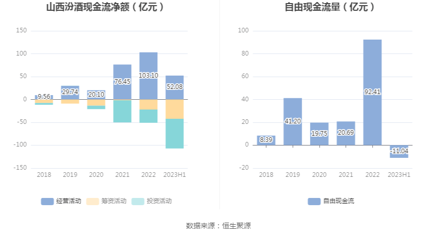 2023上半年,公司经营活动现金流净额为52.08亿元,同比增长11.22%;筹资活动现金流净额-42.33亿元,同比减少22.76亿元,主要系本期分配的现金红利增加所致;投资活动现金流净额-64.79亿元,上年同期为-30.19亿元,主要系本期收回到期的理财产品减少,收回投资所收到的现金减少所致。