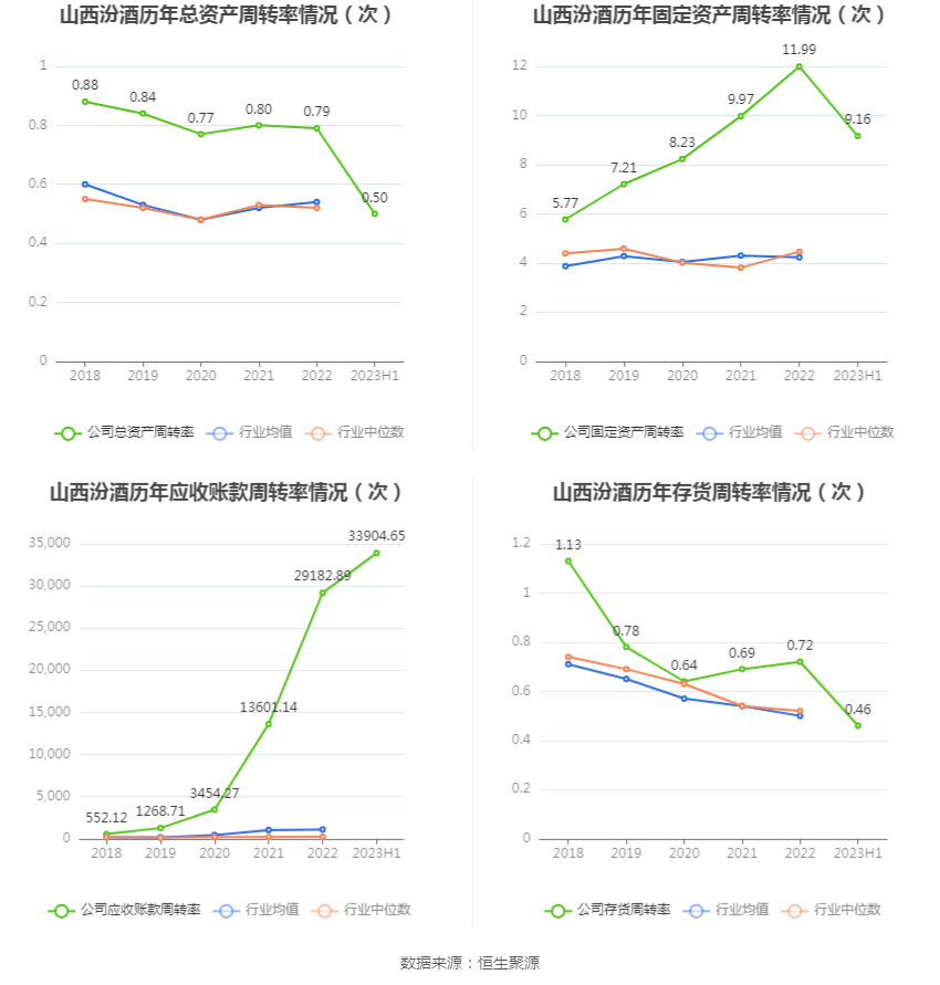 营运能力方面,2023年上半年,公司总资产周转率为0.50次,上年同期为0.50次(2022年上半年行业平均值为0.29次,公司位居同行业1/20);固定资产周转率为9.16次,上年同期为6.88次(2022年上半年行业平均值为2.30次,公司位居同行业2/20);公司应收账款周转率、存货周转率分别为33904.65次、0.46次。