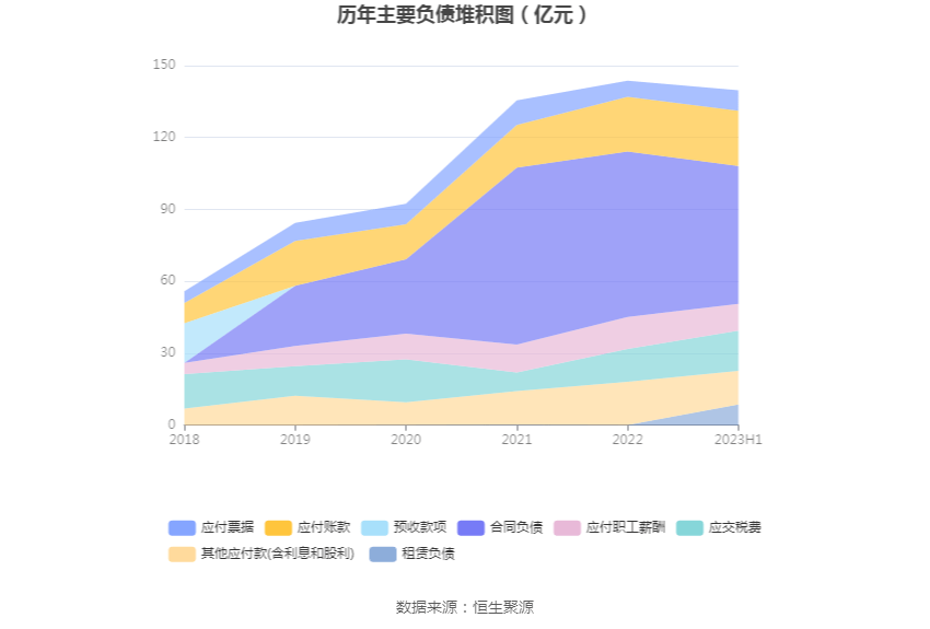 负债重大变化方面,截至2023年二季度末,公司合同负债较上年末减少16.72%,占公司总资产比重下降4.22个百分点;一年内到期的非流动负债较上年末增加2040.02%,占公司总资产比重上升0.44个百分点;其他流动负债较上年末减少26.79%,占公司总资产比重下降0.41个百分点;应付账款较上年末增加0.51%,占公司总资产比重下降0.40个百分点。