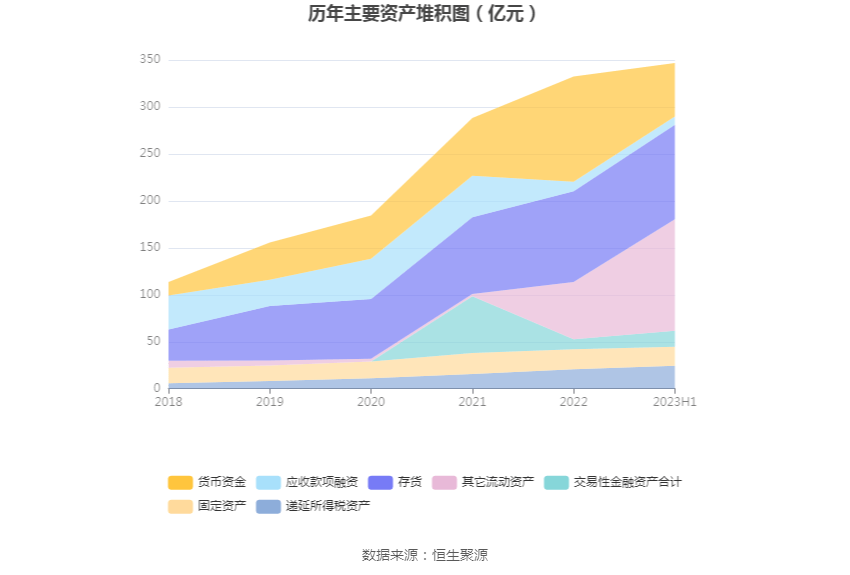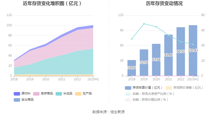 从存货变动来看,截至2023年上半年末,公司存货账面价值为100.43亿元,占净资产的41.71%,较上年末增加3.93亿元。其中,存货跌价准备为382.96万元,计提比例为0.04%。