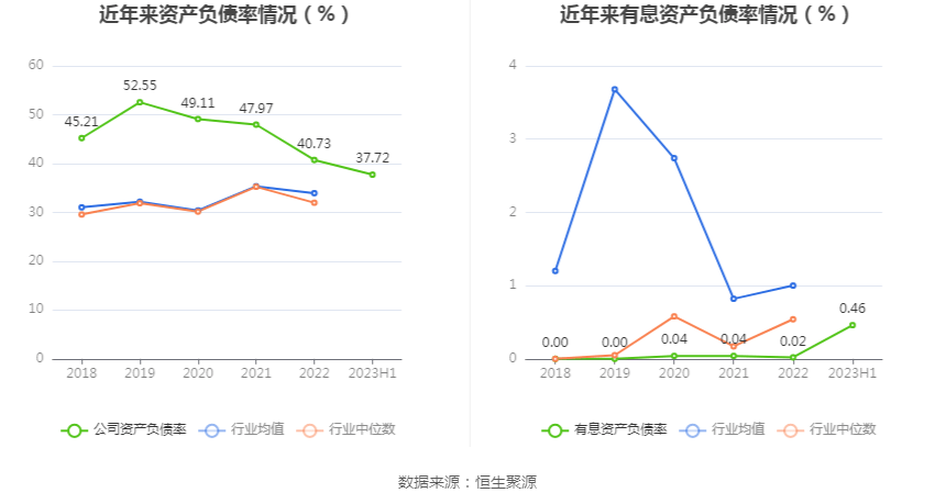 偿债能力方面,公司2023年二季度末资产负债率为37.72%,相比上年末减少3.01个百分点;有息资产负债率为0.46%,相比上年末增加0.44个百分点。