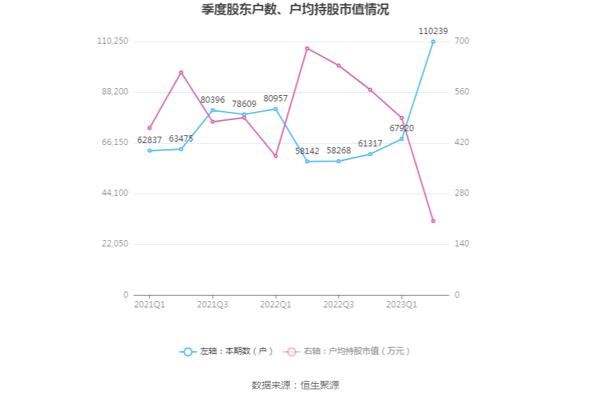 筹码集中度方面,截至2023年二季度末,公司股东总户数为11.02万户,较一季度末增长了4.23万户,增幅62.31%;户均持股市值由一季度末的489.32万元下降至204.81万元,降幅为58.14%。