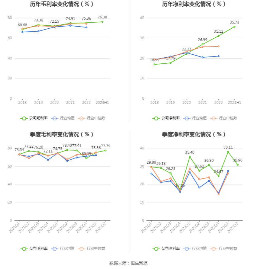 2023年上半年,公司毛利率为76.30%,同比上升0.41个百分点;净利率为35.73%,较上年同期上升2.76个百分点。从单季度指标来看,2023年第二季度公司毛利率为77.79%,同比下降0.61个百分点,环比上升2.23个百分点;净利率为30.96%,较上年同期上升3.34个百分点,较上一季度下降7.15个百分点。