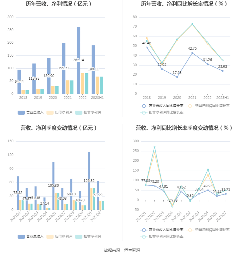 根据半年报,公司第二季度实现营业总收入63.29亿元,同比增长31.75%,环比下降50.10%;归母净利润19.48亿元,同比增长49.57%,环比下降59.57%;扣非净利润19.46亿元,同比增长49.81%,环比下降59.56%。