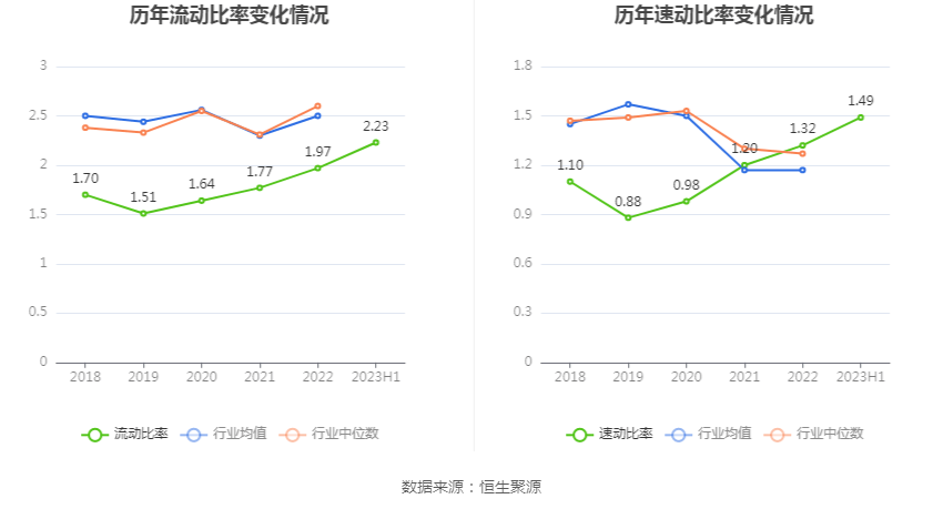 2023年上半年,公司流动比率为2.23,速动比率为1.49。