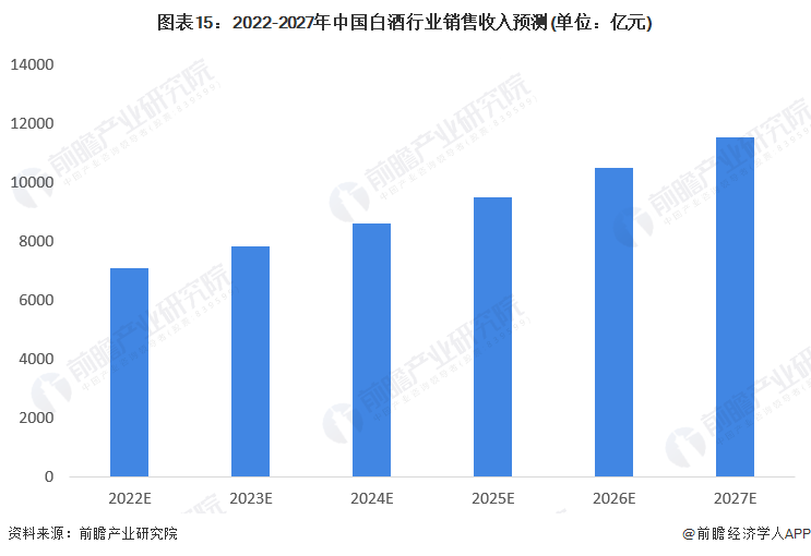 根据《中国酒业“十四五”发展指导意见》, 在产业经济目标上,预计2025年,销售收入达到9500亿元,增长62.8%,年均递增10.2%。根据年均复合增长率进一步测算,2026年,白酒行业销售收入有望突破万亿元大关,2027年白酒行业销售收入将达到11537亿元。