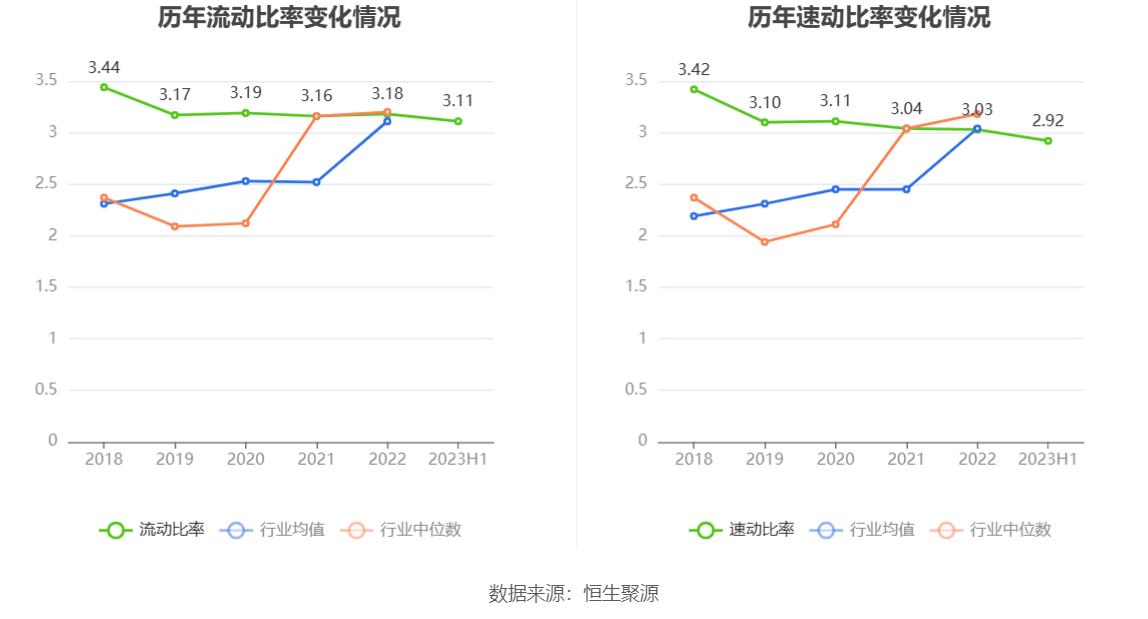 2023年上半年,公司流动比率为3.11,速动比率为2.92。