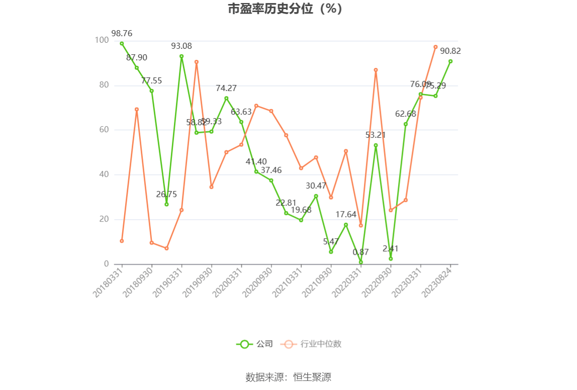 市盈率为负时,不显示当期分位数,会导致折线图中断。