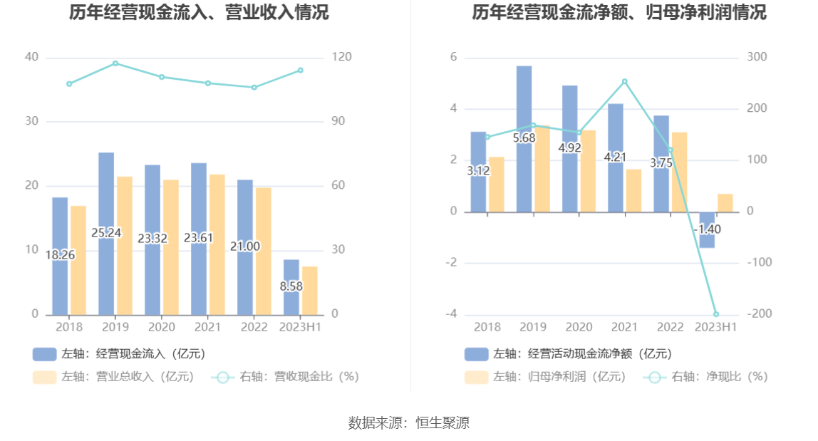 2023年上半年,公司营业收入现金比为114.19%,净现比为-199.03%。