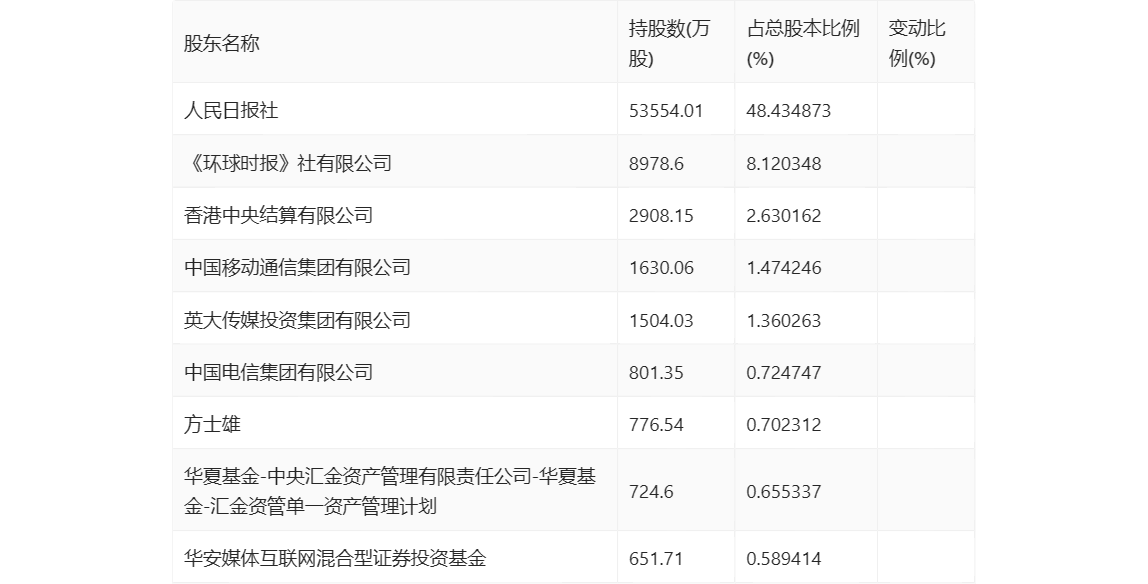 半年报显示,2023年上半年末的公司十大流通股东中,新进股东为方士雄、华安媒体互联网混合型证券投资基金,取代了一季度末的中国电影集团公司、中国联合网络通信集团有限公司、《中国汽车报》社有限公司。在具体持股比例上,香港中央结算有限公司、华夏基金-中央汇金资产管理有限责任公司-华夏基金-汇金资管单一资产管理计划持股有所上升。