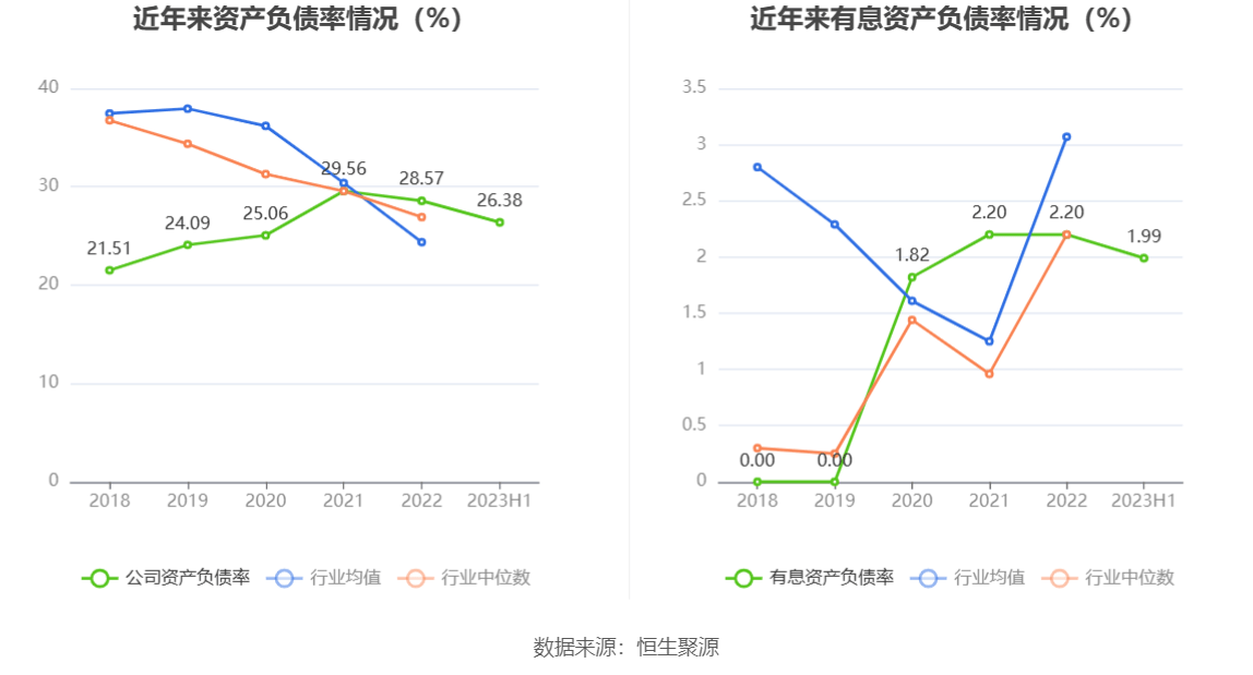偿债能力方面,公司2023年二季度末资产负债率为26.38%,相比上年末减少2.19个百分点;有息资产负债率为1.99%,相比上年末减少0.21个百分点。