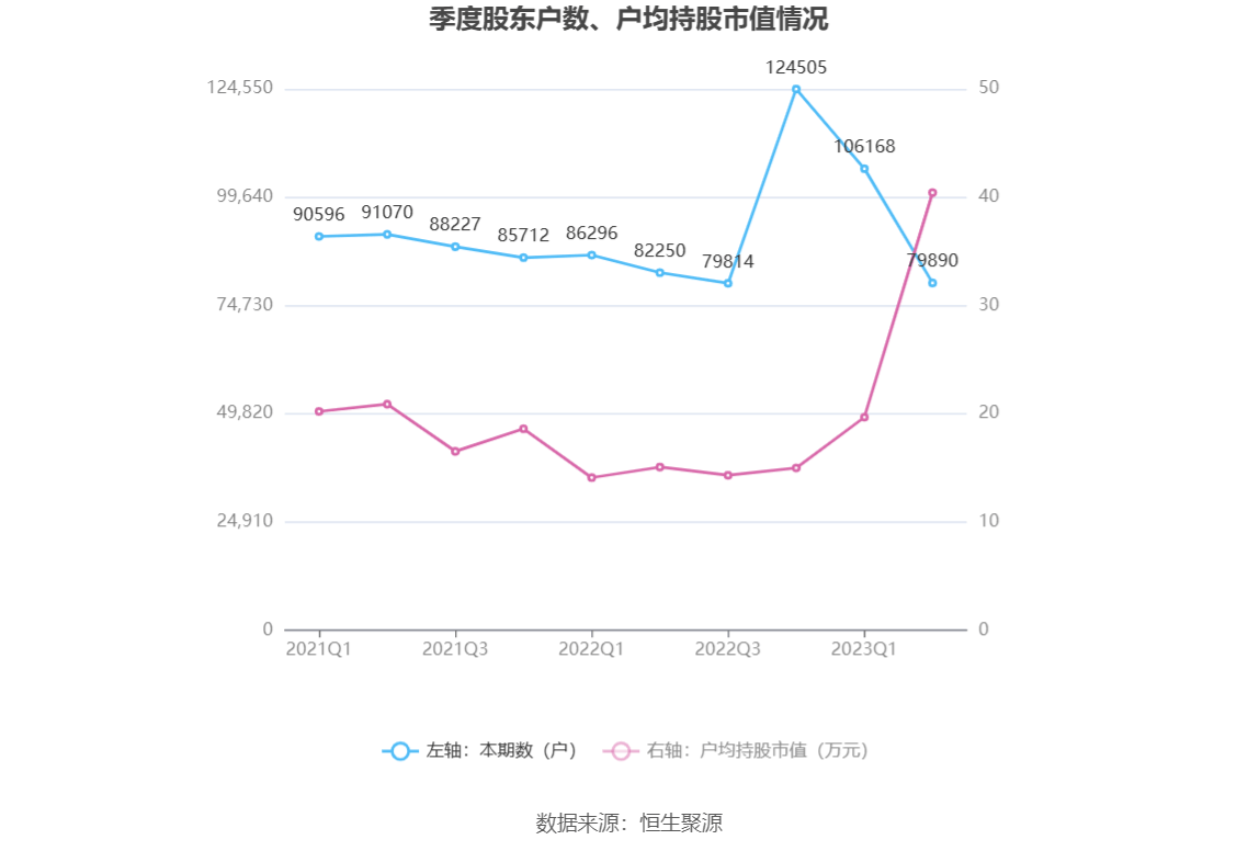 筹码集中度方面,截至2023年二季度末,公司股东总户数为7.99万户,较一季度末下降了2.63万户,降幅24.75%;户均持股市值由一季度末的19.67万元上升至40.41万元,增幅为105.44%。