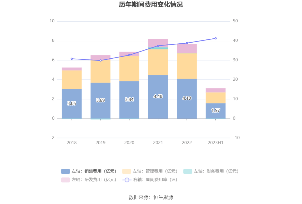 2023年上半年,公司期间费用为3.10亿元,较上年同期减少1030.43万元;期间费用率为41.22%,较上年同期下降3.50个百分点。其中,销售费用同比下降4.26%,管理费用同比增长0.9%,研发费用同比增长10.91%,财务费用由去年同期的574.42万元变为-277.05万元。