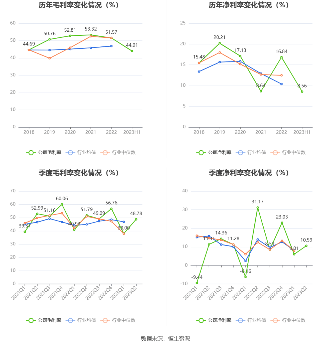 2023年上半年,公司毛利率为44.01%,同比下降2.92个百分点;净利率为8.56%,较上年同期下降5.91个百分点。从单季度指标来看,2023年第二季度公司毛利率为48.78%,同比下降3.01个百分点,环比上升10.78个百分点;净利率为10.59%,较上年同期下降20.58个百分点,较上一季度上升4.58个百分点。