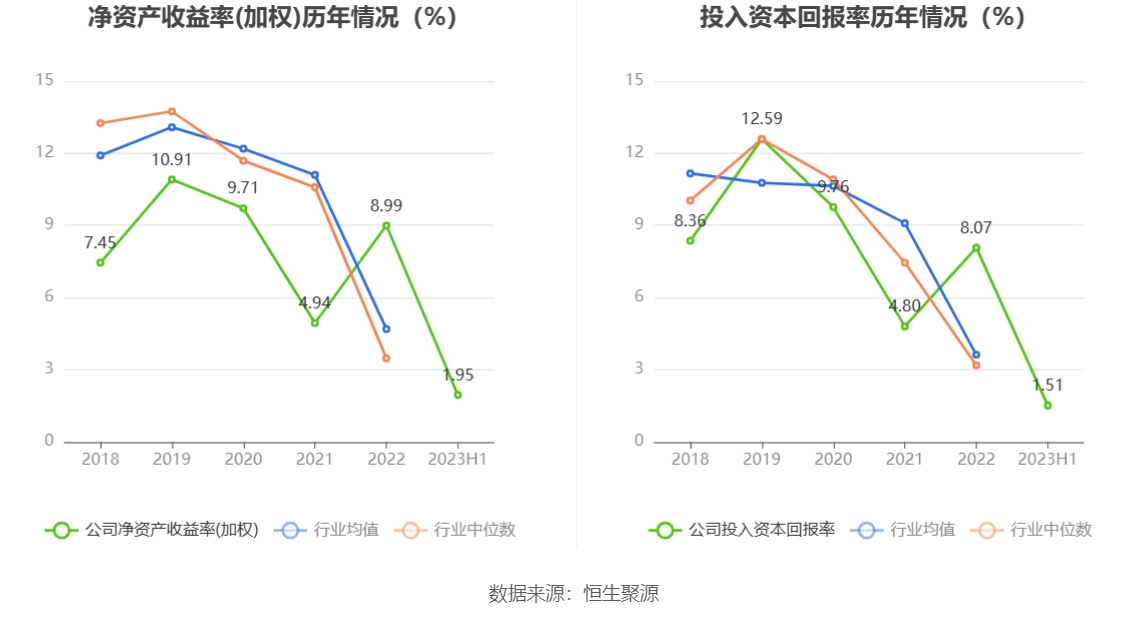 数据显示,2023年上半年公司加权平均净资产收益率为1.95%,较上年同期下降1.24个百分点;公司2023年上半年投入资本回报率为1.51%,较上年同期下降1.14个百分点。