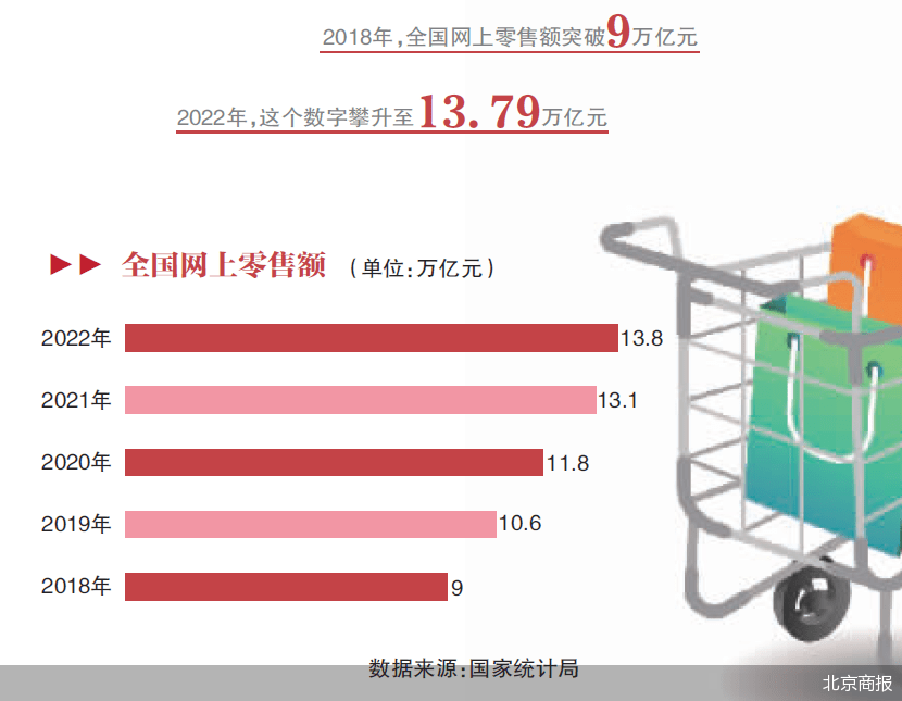 回望过去五年,中国线上消费规模以令人惊叹的速度跃升。2018年,全国网上零售额突破9万亿元,到了2022年,这个数字攀升到了13.79万亿元。然而,随着电商企业开疆拓土,加速线上消费习惯的渗透,全国网上零售额的增速已呈现逐年放缓的迹象,从2018年的23.9%下降至2022年的4%。
