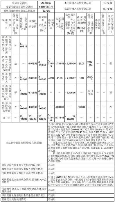 公司于2022年12月12日经公司第二届董事会第十一次会议、第二届监事会第九次会议审议通过《关于变更部分募集资金用途并向全资子公司增资以实施新募投项目的议案》,该议案并于2022年12月28日经公司2022年第四次临时股东大会审议通过,同意变更部分募集资金用途,使用募集资金向全资子公司增资以实施新募投项目。公司拟暂缓实施“丽水市杭丽热电项目集中供气技术改造工程项目”,将该项目原计划投入的募集资金6,689.13万元及截至2022年11月30日该项目在专户产生的利息224.40万元,合计6,913.53万元投入到全资子公司浙江安吉天子湖热电有限公司,专项用于“燃煤耦合一般工业固废热电联产技改项目”的实施。截至2023年6月30日该项目募投资金使用情况详见附表2《变更募集资金投资项目情况表》。