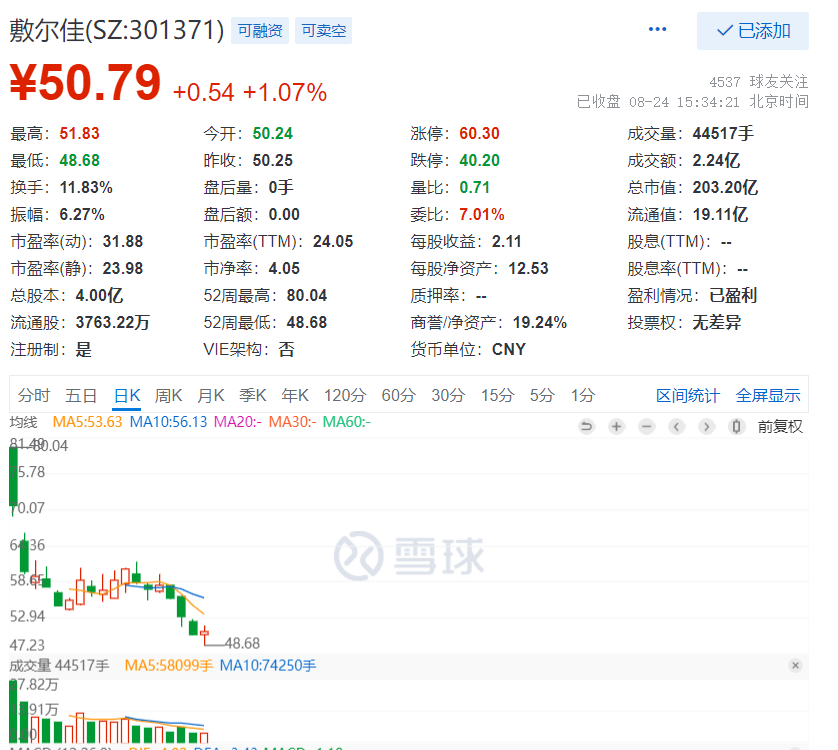 或许因为这个原因,敷尔佳的股价自上市后逐步走低,目前已从2023年8月2日的80元/股的开盘价跌至50.79元/股,跌幅高达36.51%。