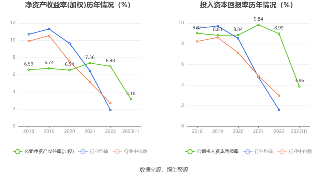 数据显示,2023年上半年公司加权平均净资产收益率为3.16%,较上年同期增长0.01个百分点;公司2023年上半年投入资本回报率为3.86%,较上年同期下降0.18个百分点。