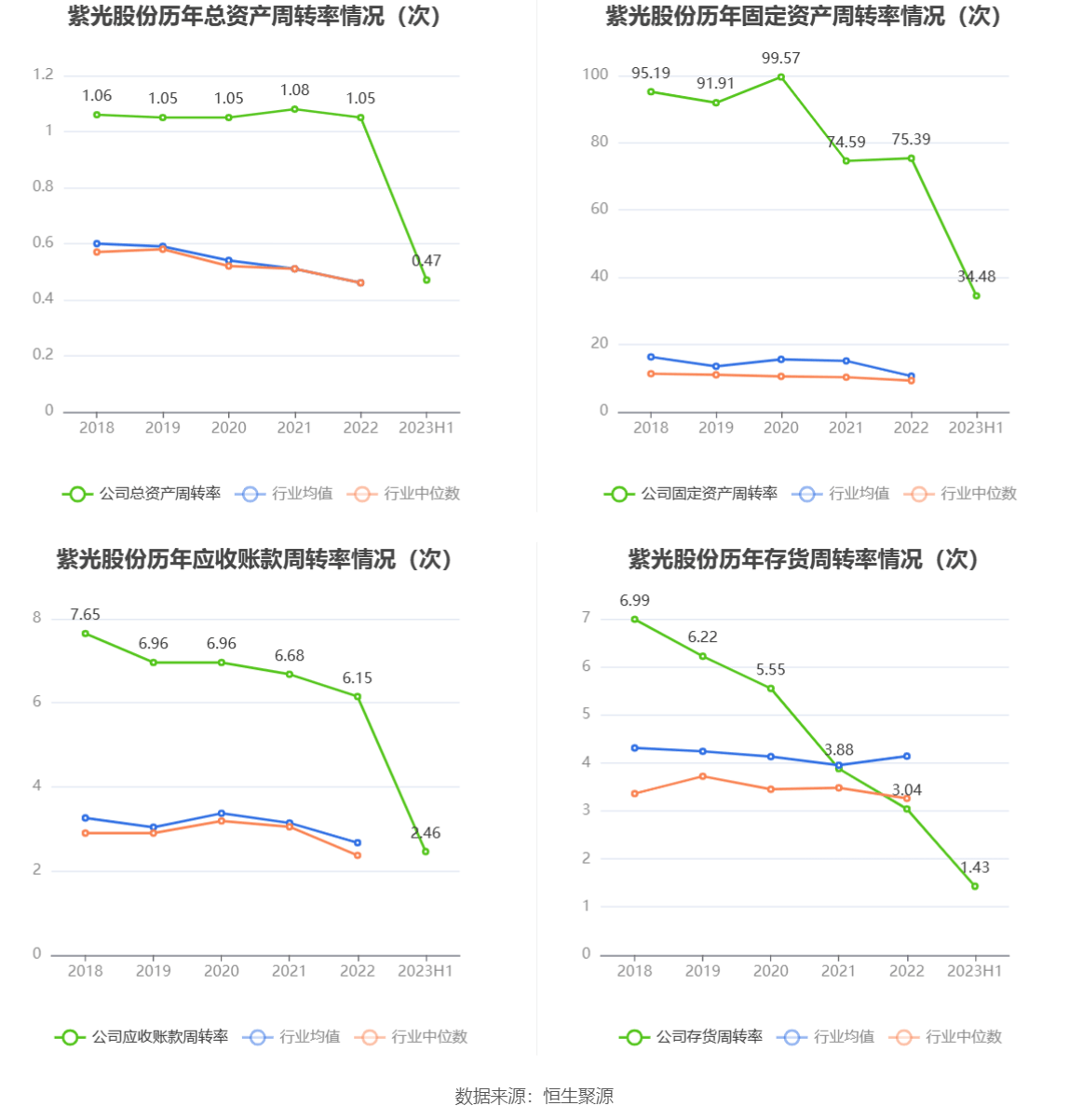 营运能力方面,2023年上半年,公司总资产周转率为0.47次,上年同期为0.50次(2022年上半年行业平均值为0.20次,公司位居同行业7/133);固定资产周转率为34.48次,上年同期为35.56次(2022年上半年行业平均值为5.00次,公司位居同行业10/133);公司应收账款周转率、存货周转率分别为2.46次、1.43次。