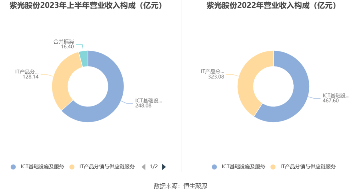 分产品来看,2023年上半年公司主营业务中,ICT基础设施及服务收入248.08亿元,同比增长12.11%,占营业收入的68.82%;IT产品分销与供应链服务收入128.14亿元,同比下降10.96%,占营业收入的35.55%;合并抵消收入16.40亿元,同比下降25.73%,占营业收入的4.55%。