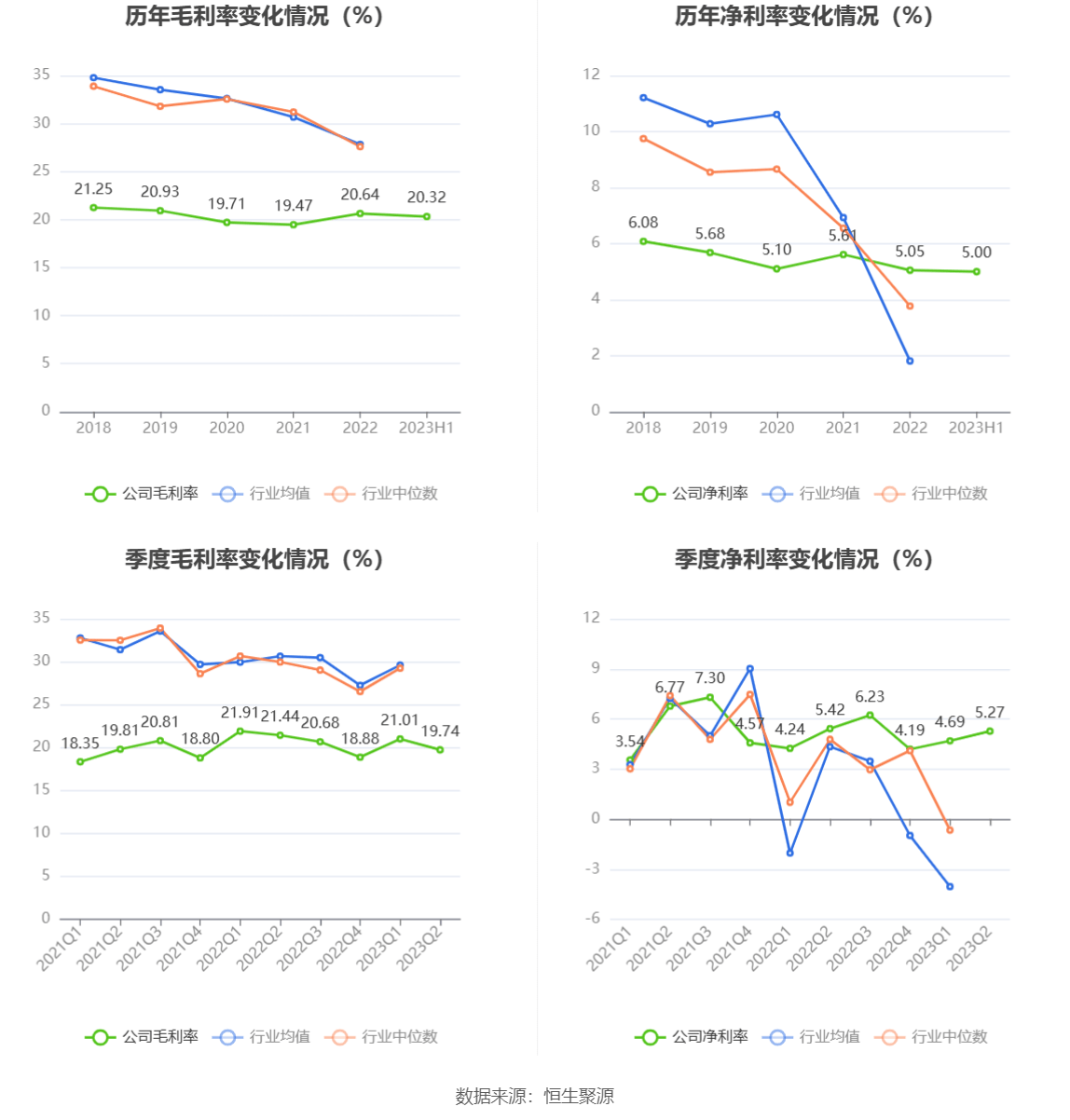 2023年上半年,公司毛利率为20.32%,同比下降1.33个百分点;净利率为5.00%,较上年同期上升0.11个百分点。从单季度指标来看,2023年第二季度公司毛利率为19.74%,同比下降1.70个百分点,环比下降1.27个百分点;净利率为5.27%,较上年同期下降0.15个百分点,较上一季度上升0.58个百分点。