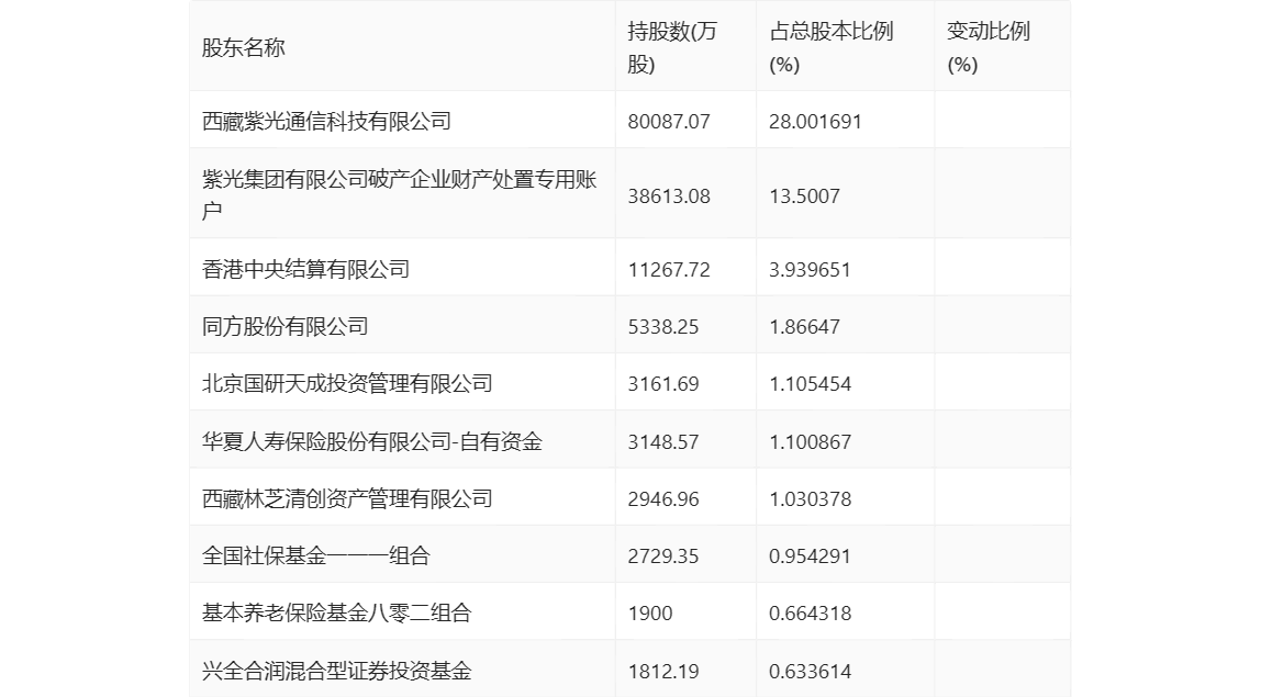 半年报显示,2023年上半年末的公司十大流通股东中,新进股东为基本养老保险基金八零二组合、兴全合润混合型证券投资基金,取代了一季度末的北京屹唐同舟股权投资中心(有限合伙)、全国社保基金一一三组合。在具体持股比例上,香港中央结算有限公司持股有所上升,紫光集团有限公司破产企业财产处置专用账户、同方股份有限公司、北京国研天成投资管理有限公司、华夏人寿保险股份有限公司-自有资金、西藏林芝清创资产管理有限公司、全国社保基金一一一组合持股有所下降。
