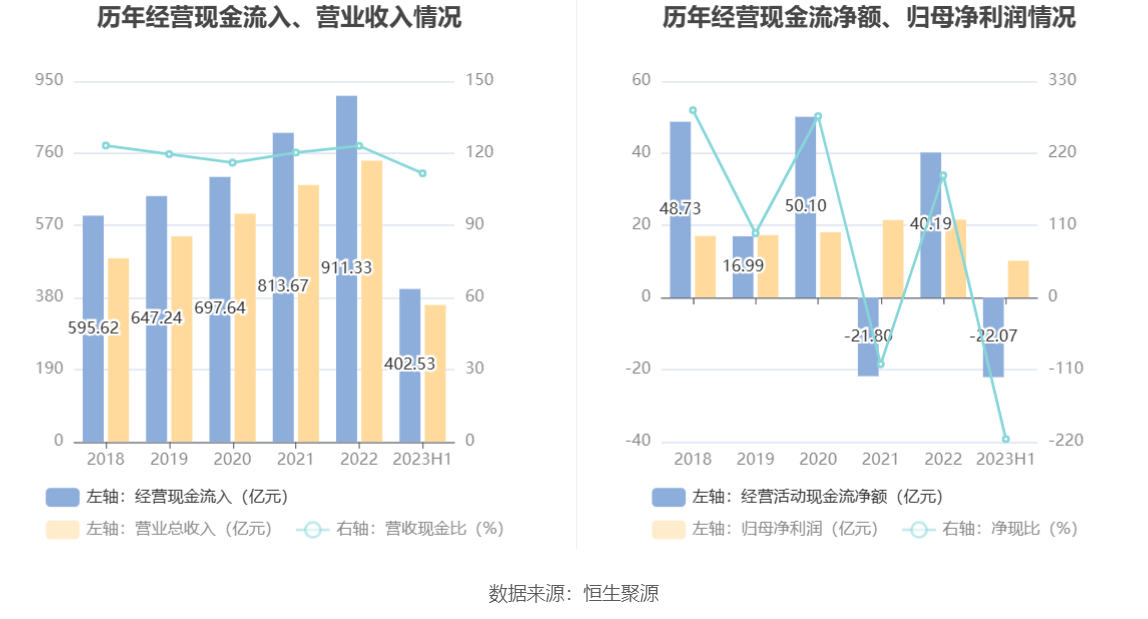 2023上半年,公司经营活动现金流净额为-22.07亿元,同比减少5.71亿元;筹资活动现金流净额33.48亿元,同比增加32.09亿元;投资活动现金流净额1.04亿元,上年同期为5.86亿元。