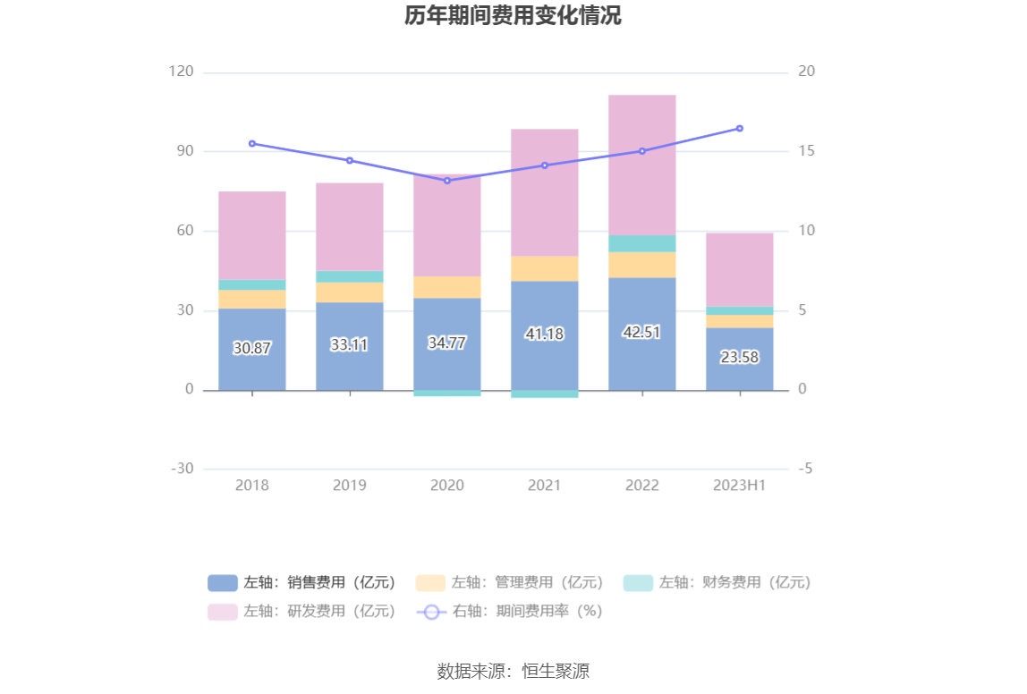 2023年上半年,公司期间费用为59.39亿元,较上年同期增加5.77亿元;期间费用率为16.48%,较上年同期上升0.89个百分点。其中,销售费用同比增长5.71%,管理费用同比增长5.45%,研发费用同比增长14.47%,财务费用同比增长29.62%。