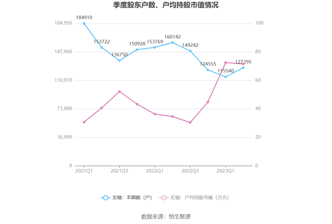 筹码集中度方面,截至2023年二季度末,公司股东总户数为12.74万户,较一季度末增长了1.19万户,增幅10.26%;户均持股市值由一季度末的72.50万元下降至71.50万元,降幅为1.38%。