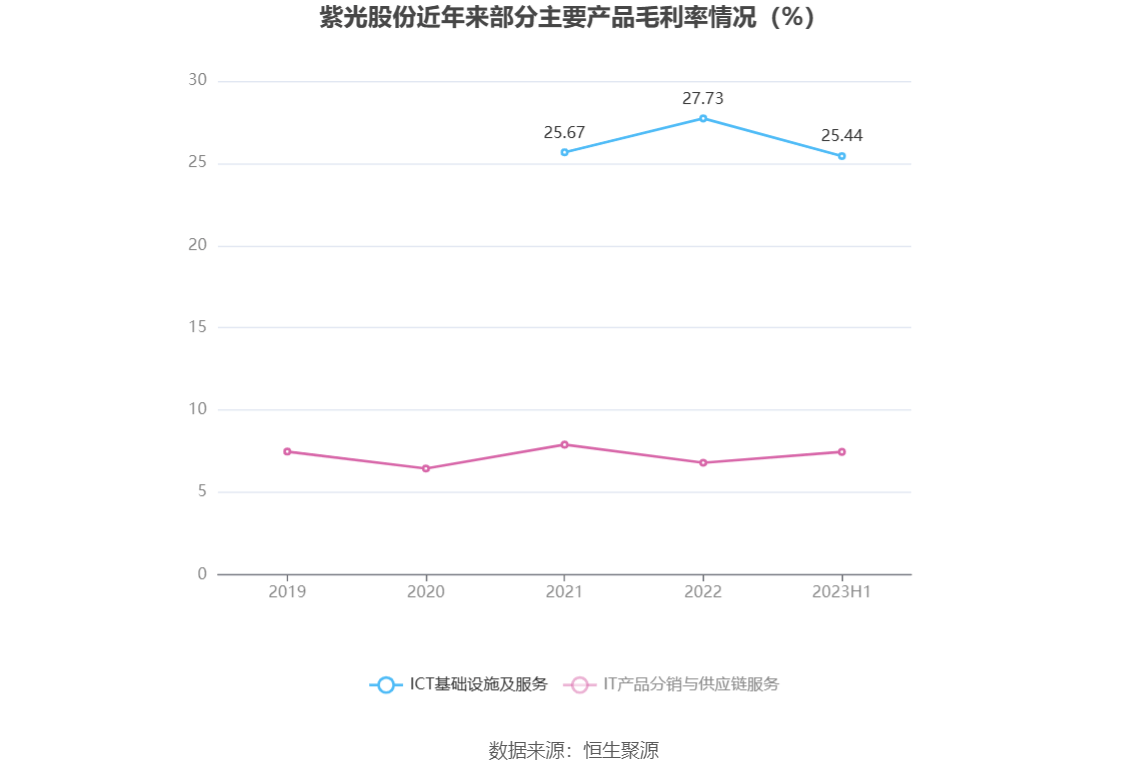 分产品看,ICT基础设施及服务、IT产品分销与供应链服务2023年上半年毛利率分别为25.44%、7.46%。
