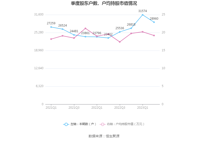 筹码集中度方面,截至2023年二季度末,公司股东总户数为2.9万户,较一季度末下降了2614户,降幅8.28%;户均持股市值由一季度末的20.23万元下降至19.20万元,降幅为5.09%。