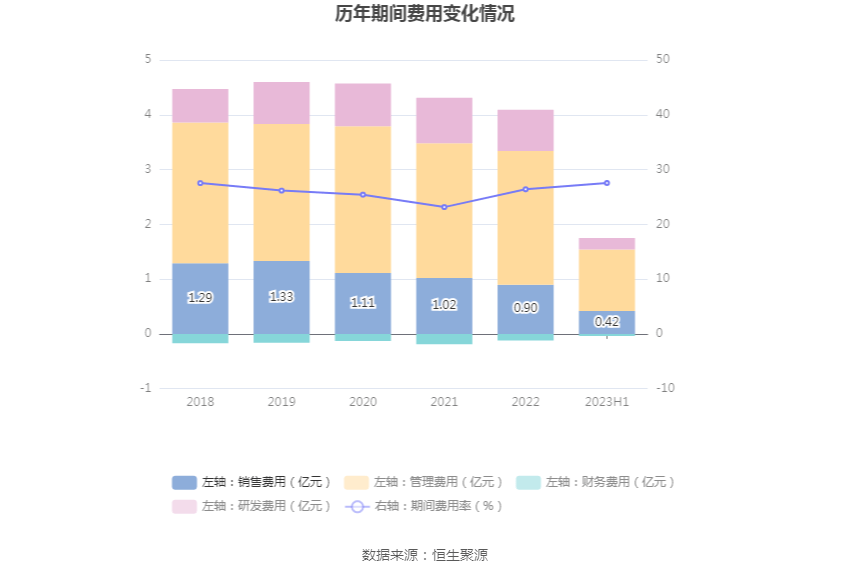 2023年上半年,公司期间费用为1.71亿元,较上年同期增加410.72万元;期间费用率为27.55%,较上年同期上升3.76个百分点。其中,销售费用同比增长2.96%,管理费用同比增长5.19%,研发费用同比下降16.95%,财务费用由去年同期的-553.83万元变为-384.29万元。