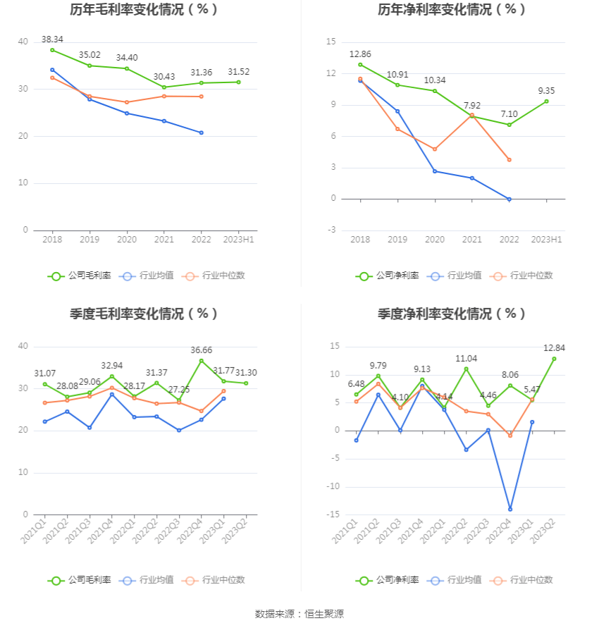 2023年上半年,公司毛利率为31.52%,同比上升1.69个百分点;净利率为9.35%,较上年同期上升1.63个百分点。从单季度指标来看,2023年第二季度公司毛利率为31.30%,同比下降0.07个百分点,环比下降0.47个百分点;净利率为12.84%,较上年同期上升1.80个百分点,较上一季度上升7.37个百分点。