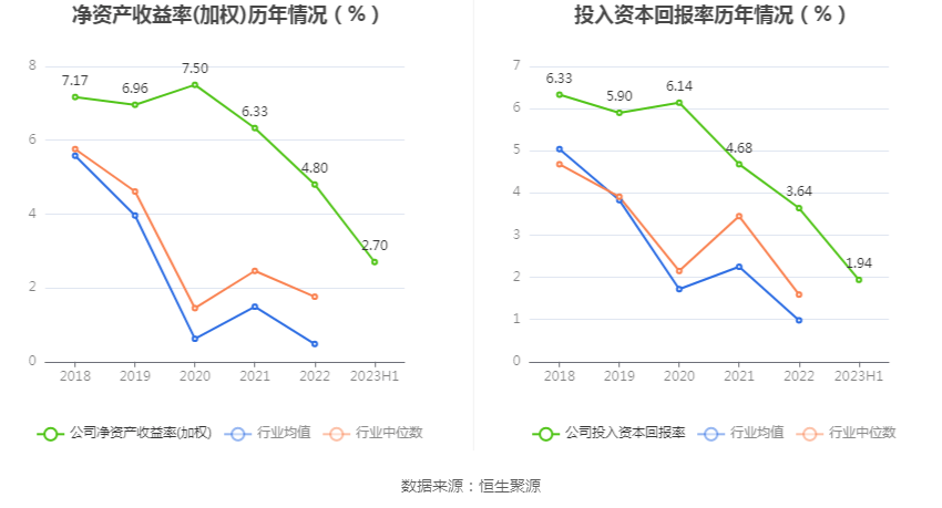 数据显示,2023年上半年公司加权平均净资产收益率为2.70%,较上年同期增长0.31个百分点;公司2023年上半年投入资本回报率为1.94%,较上年同期下降0.04个百分点。