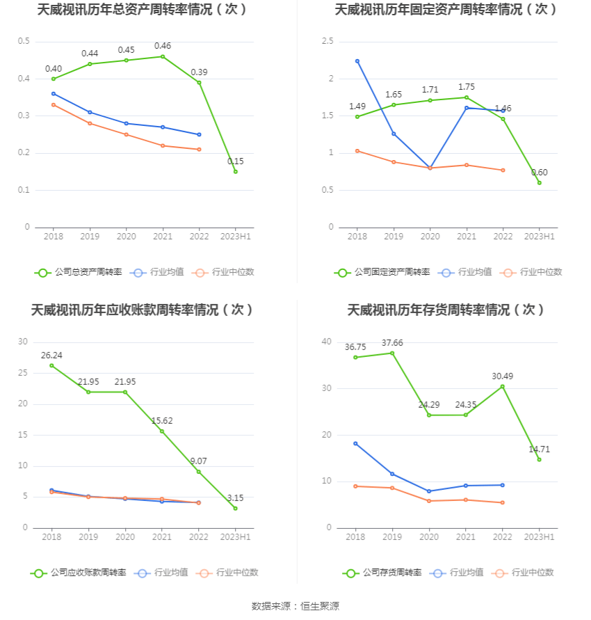 营运能力方面,2023年上半年,公司总资产周转率为0.15次,上年同期为0.19次(2022年上半年行业平均值为0.12次,公司位居同行业3/14);固定资产周转率为0.60次,上年同期为0.70次(2022年上半年行业平均值为0.76次,公司位居同行业5/14);公司应收账款周转率、存货周转率分别为3.15次、14.71次。