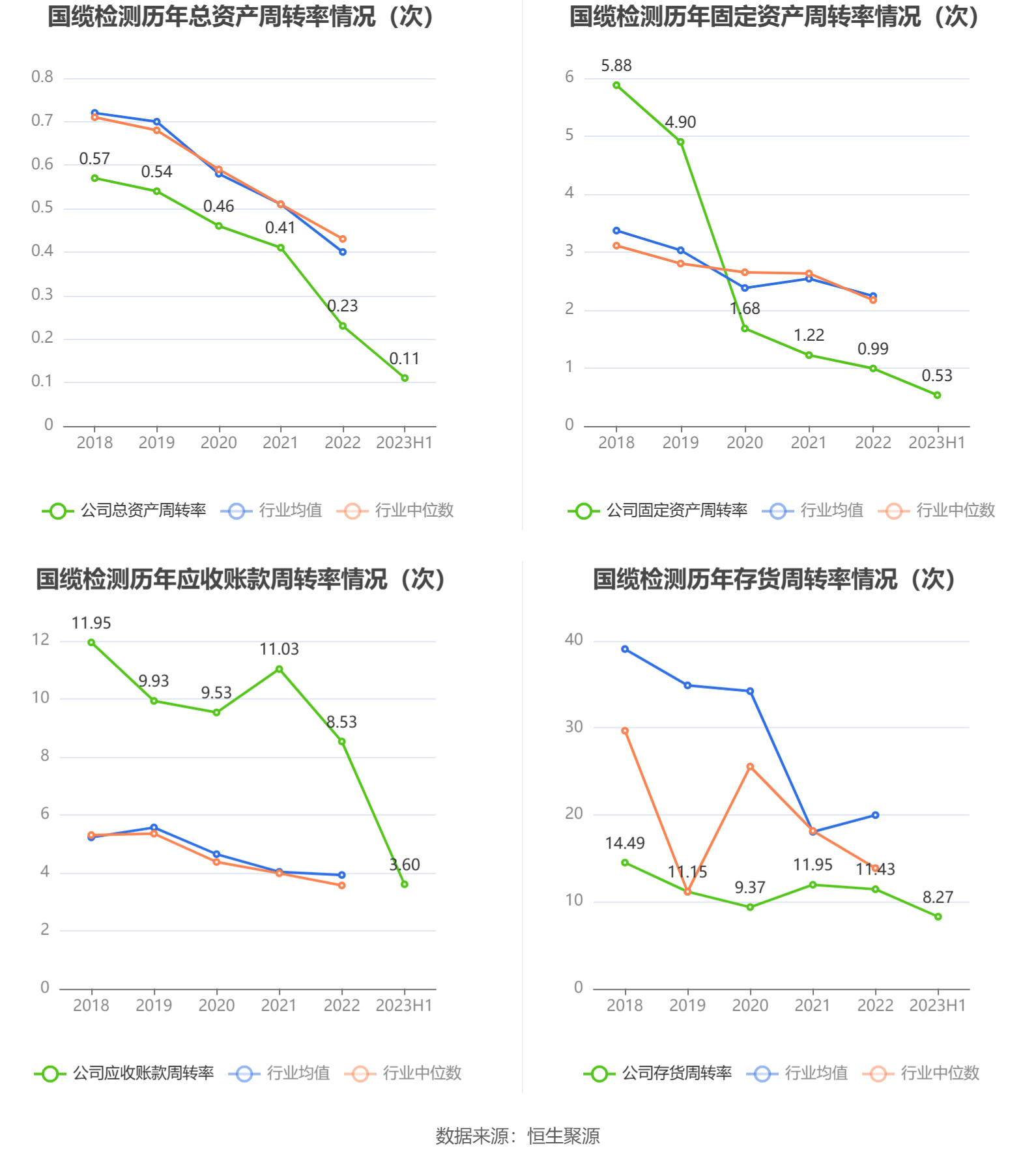 营运能力方面,2023年上半年,公司总资产周转率为0.11次,上年同期为0.10次(2022年上半年行业平均值为0.18次,公司位居同行业15/18);固定资产周转率为0.53次,上年同期为0.47次(2022年上半年行业平均值为0.96次,公司位居同行业14/18);公司应收账款周转率、存货周转率分别为3.60次、8.27次。