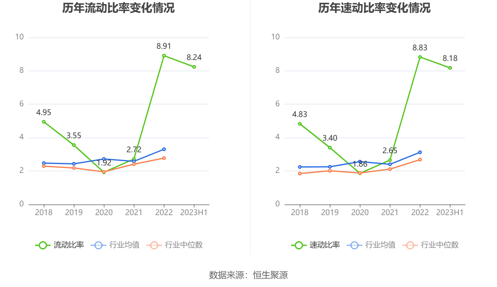 2023年上半年,公司流动比率为8.24,速动比率为8.18。