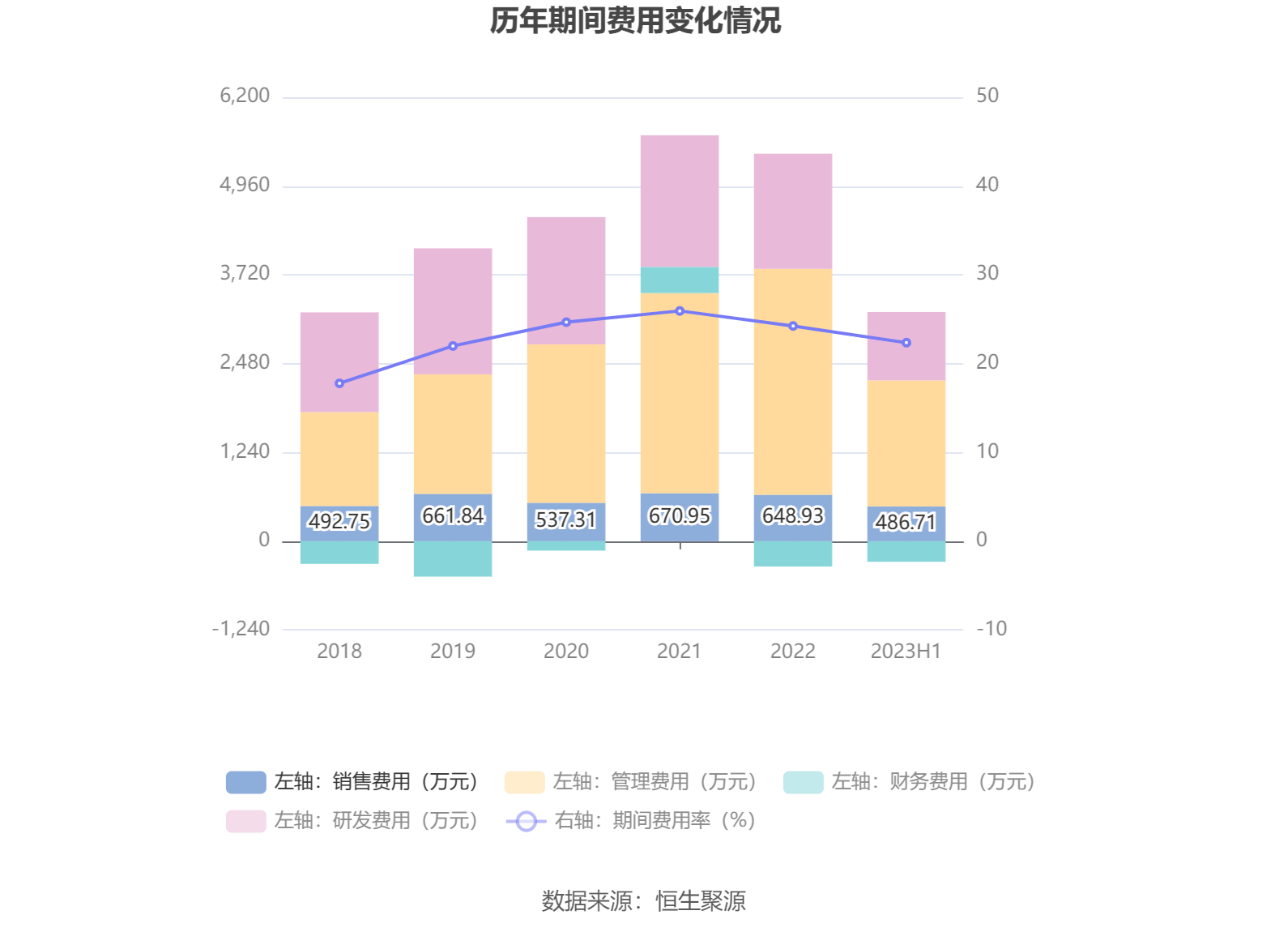 2023年上半年,公司期间费用为2914.97万元,较上年同期增加710.94万元;但期间费用率为22.36%,较上年同期下降3.17个百分点。其中,销售费用同比增长89.61%,管理费用同比增长48.46%,研发费用同比增长25.72%,财务费用由去年同期的2.17万元变为-286.72万元。