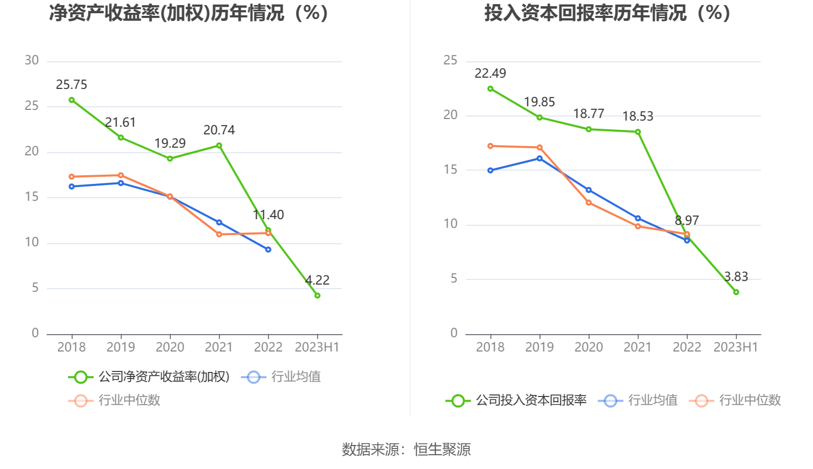 数据显示,2023年上半年公司加权平均净资产收益率为4.22%,较上年同期下降2.09个百分点;公司2023年上半年投入资本回报率为3.83%,较上年同期增长0.32个百分点。
