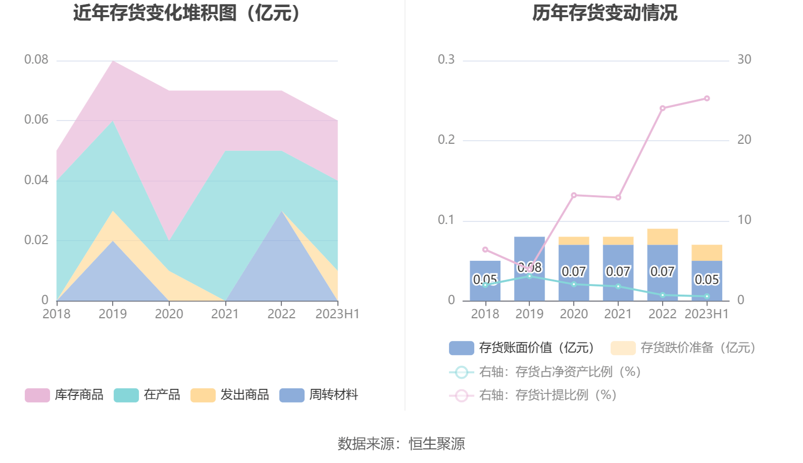 从存货变动来看,截至2023年上半年末,公司存货账面价值为514.24万元,占净资产的0.57%,较上年末减少138.05万元。其中,存货跌价准备为173.96万元,计提比例为25.28%。