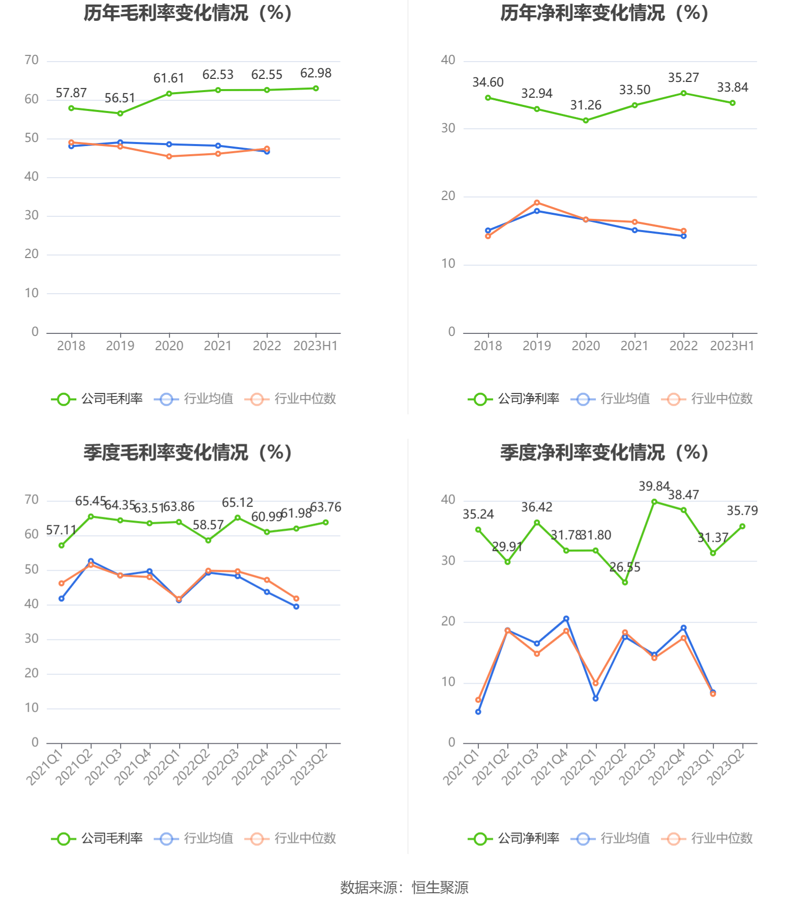 2023年上半年,公司毛利率为62.98%,同比上升1.18个百分点;净利率为33.84%,较上年同期上升4.08个百分点。从单季度指标来看,2023年第二季度公司毛利率为63.76%,同比上升5.19个百分点,环比上升1.78个百分点;净利率为35.79%,较上年同期上升9.24个百分点,较上一季度上升4.42个百分点。