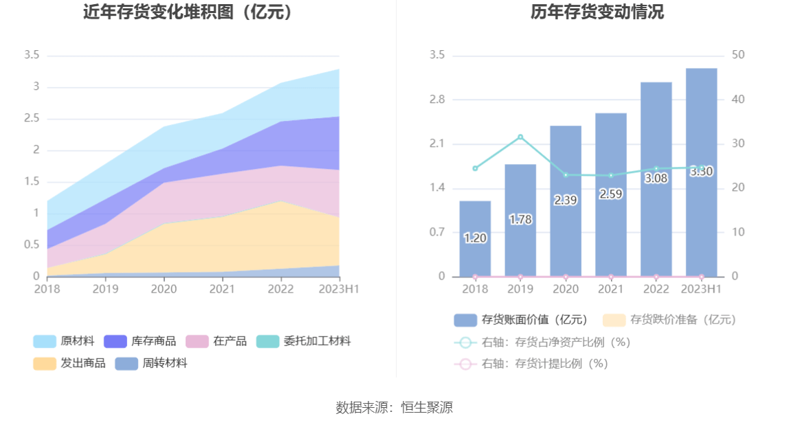 从存货变动来看,截至2023年上半年末,公司存货账面价值为3.3亿元,占净资产的24.73%。根据财报,公司本期没有计提存货跌价准备。