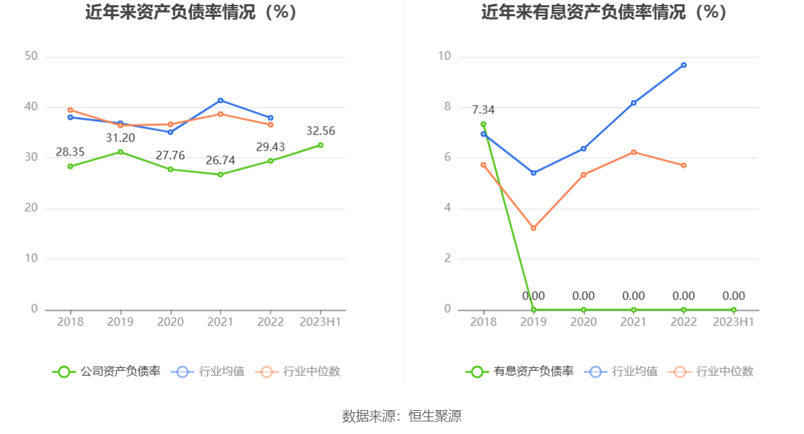 偿债能力方面,公司2023年二季度末资产负债率为32.56%,相比上年末增加3.13个百分点;有息资产负债率为0.00%,相比上年末持平。