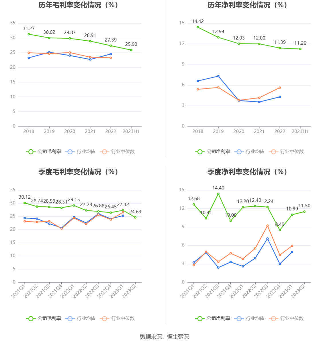 2023年上半年,公司毛利率为25.90%,同比下降2.24个百分点;净利率为11.26%,较上年同期下降1.05个百分点。从单季度指标来看,2023年第二季度公司毛利率为24.63%,同比下降2.65个百分点,环比下降2.69个百分点;净利率为11.50%,较上年同期下降0.90个百分点,较上一季度上升0.51个百分点。