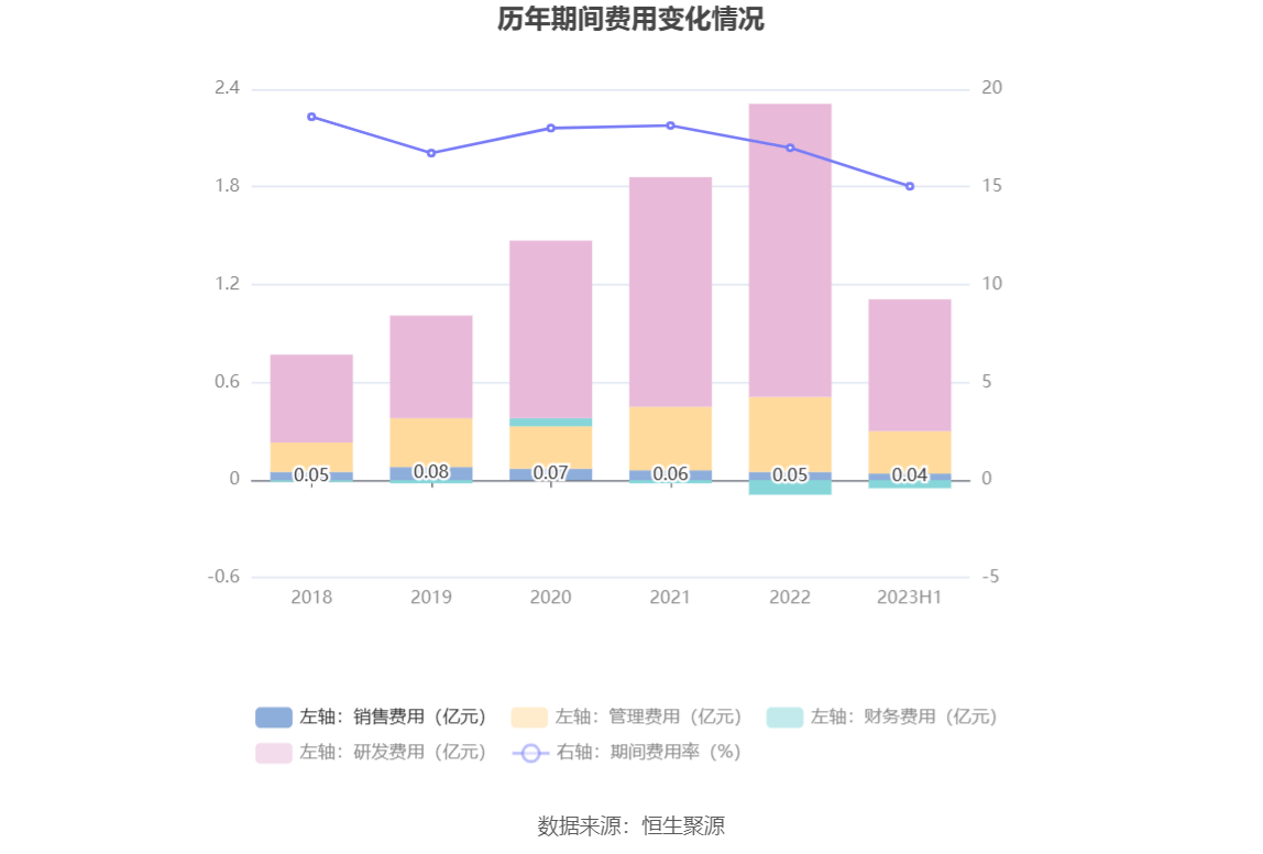 2023年上半年,公司期间费用为1.05亿元,较上年同期增加64.11万元;但期间费用率为15.03%,较上年同期下降1.49个百分点。其中,销售费用同比增长73.31%,管理费用同比增长15.6%,研发费用同比下降5.63%,财务费用由去年同期的-565.17万元变为-547.50万元。