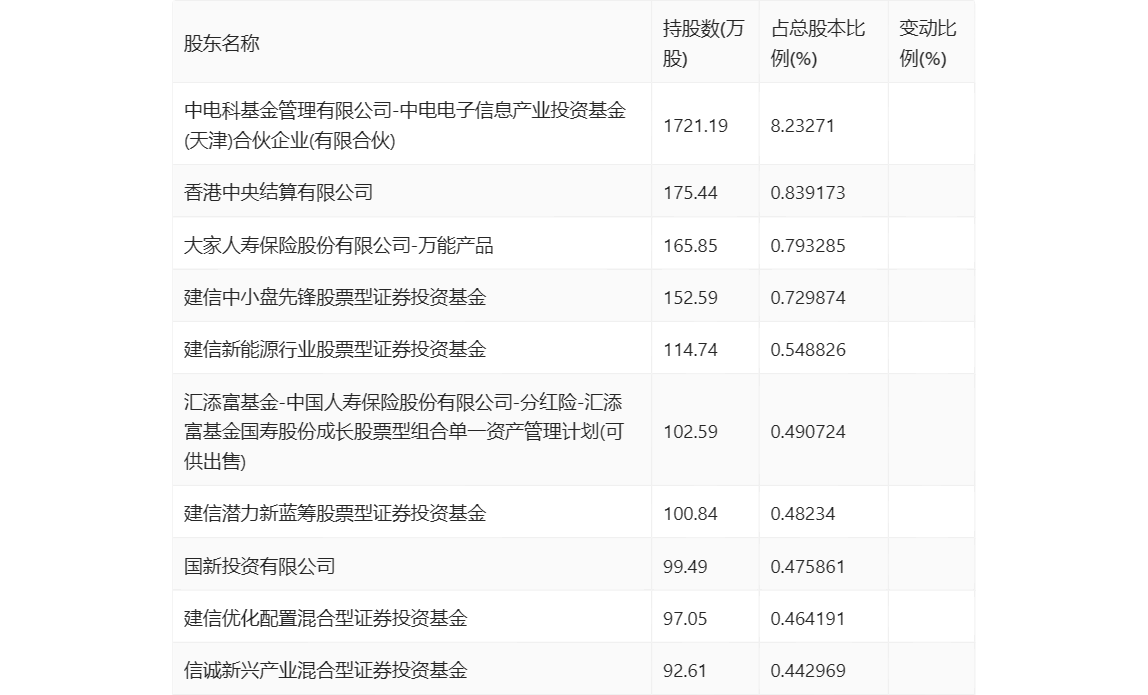 半年报显示,2023年上半年末的公司十大流通股东中,新进股东为大家人寿保险股份有限公司-万能产品、汇添富基金-中国人寿保险股份有限公司-分红险-汇添富基金国寿股份成长股票型组合单一资产管理计划(可供出售)、国新投资有限公司、信诚新兴产业混合型证券投资基金,取代了一季度末的陈高文、泰康人寿保险有限责任公司-分红-个人分红-019L-FH002深、景顺长城基金-中国人寿保险股份有限公司-分红险-景顺长城基金国寿股份成长股票型组合单一资产管理计划(可供出售)、基本养老保险基金一二零四组合。在具体持股比例上,香港中央结算有限公司、建信新能源行业股票型证券投资基金持股有所上升,建信中小盘先锋股票型证券投资基金、建信潜力新蓝筹股票型证券投资基金、建信优化配置混合型证券投资基金持股有所下降。