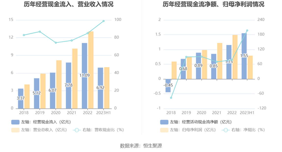 2023年上半年,公司营业收入现金比为98.77%,净现比为197.07%。